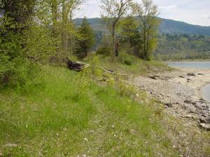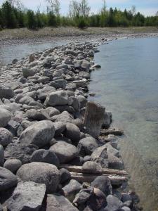 The location upstream from the mouth of the Kootenay had other advantages. During the summer freshet, and under the natural flow conditions, the Kootenay River acts as a hydraulic dam when its forceful current cuts into the Columbia. The end effect is a slight backing up of the main river and a significant reduction in its current velocity. These factors would tend to preserve the underwater stone dikes in this setting.